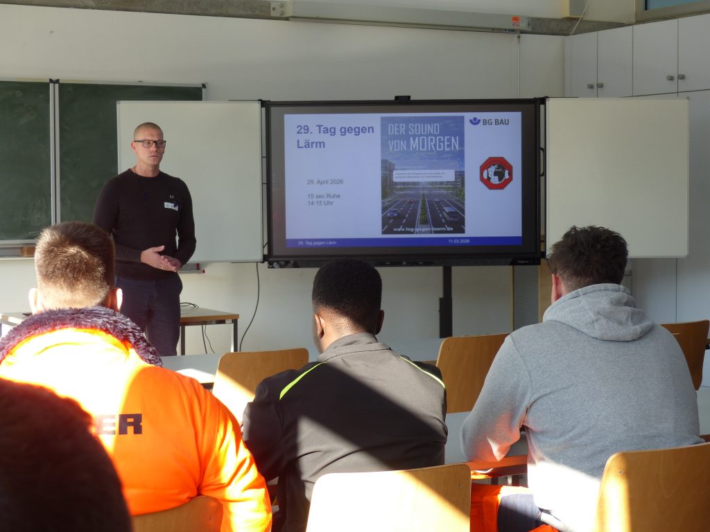Die BG Bau informierte daher an drei Tagen, 10.-12.03.2026, im ÜAZ Brandenburg an der Havel ca. 200 Auszubildende des ersten Lehrjahres über Möglichkeiten, um die schädigende Wirkung von Lärm zu reduzieren.
