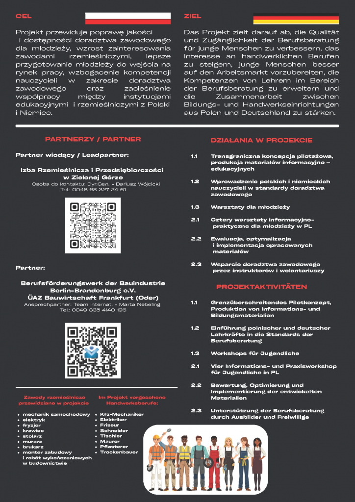 Dzięki wolontariuszom i instruktorom Izba odwiedziła szkoły w województwie lubuskim i przeprowadziła pierwsze spotkania informacyjne poświęcone zawodom rzemieślniczym. Przed nami kolejny etap – przygotowanie i wdrożenie walizek zawodowych z narzędziami oraz materiałami dwujęzycznymi, które uatrakcyjnią doradztwo zawodowe w szkołach w Polsce i Niemczech. Wkrótce będziemy mogli wspólnie z Wami realizować dalsze działania w projekcie.